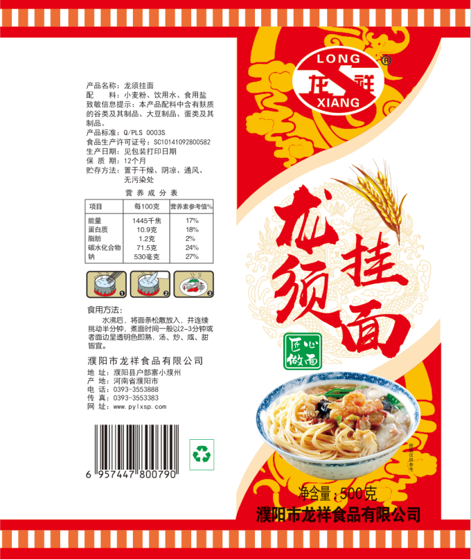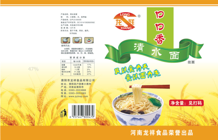 濮陽市龍祥食品有限公司位于河南省濮陽縣戶部寨鎮小濮州,始建于1994年,前期投資200萬元,經過幾年的努力,大力開發市場,由于市場的需求量急劇上升,出現供不應求,于2004年擴建,建成一座新型的現代化面粉加工企業,并擁有全國先進全自動生產設備一套,產量由以前的100噸/天,提高到現在400噸/天。 2012年再次擴大規模申請為濮陽市龍祥食品有限公司,注冊資金500萬元。2012年又投資800萬元新建掛面生產線一條,日產掛面50噸。龍祥食品有限公司現有職工120余人,總工程師1人,專業技術人員10人,經濟師1人,會計師1人,銷售人員2人,優秀專業人員20余人。 龍祥公司自創建以來,社會效益十分可觀。公司一直以“今天的質量,明天的市場”為信念,“一切為了客戶需求,竭誠追求完美品質”為企業宗旨,走專業化經營和職業化管理的路子。